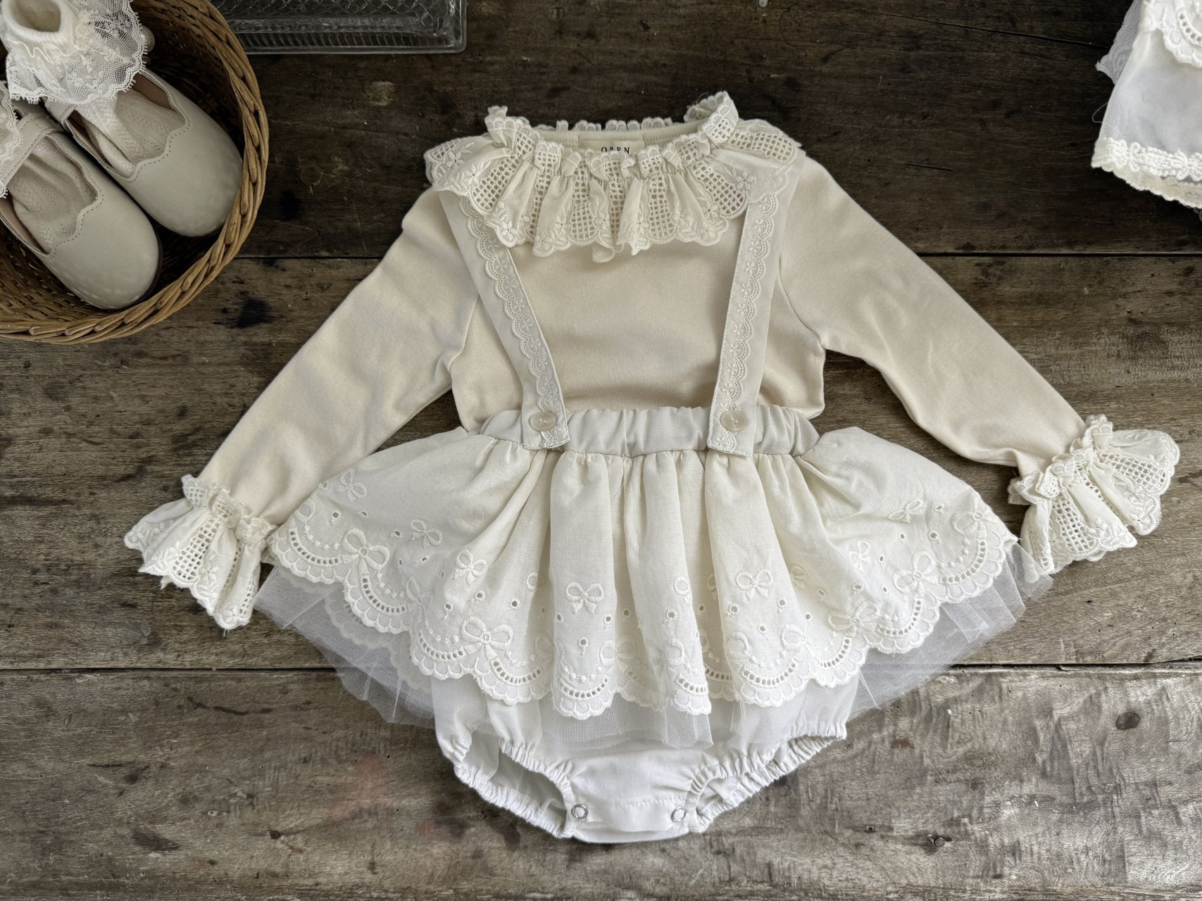 The neckline and sleeves are surrounded by crochet-style lace frills,