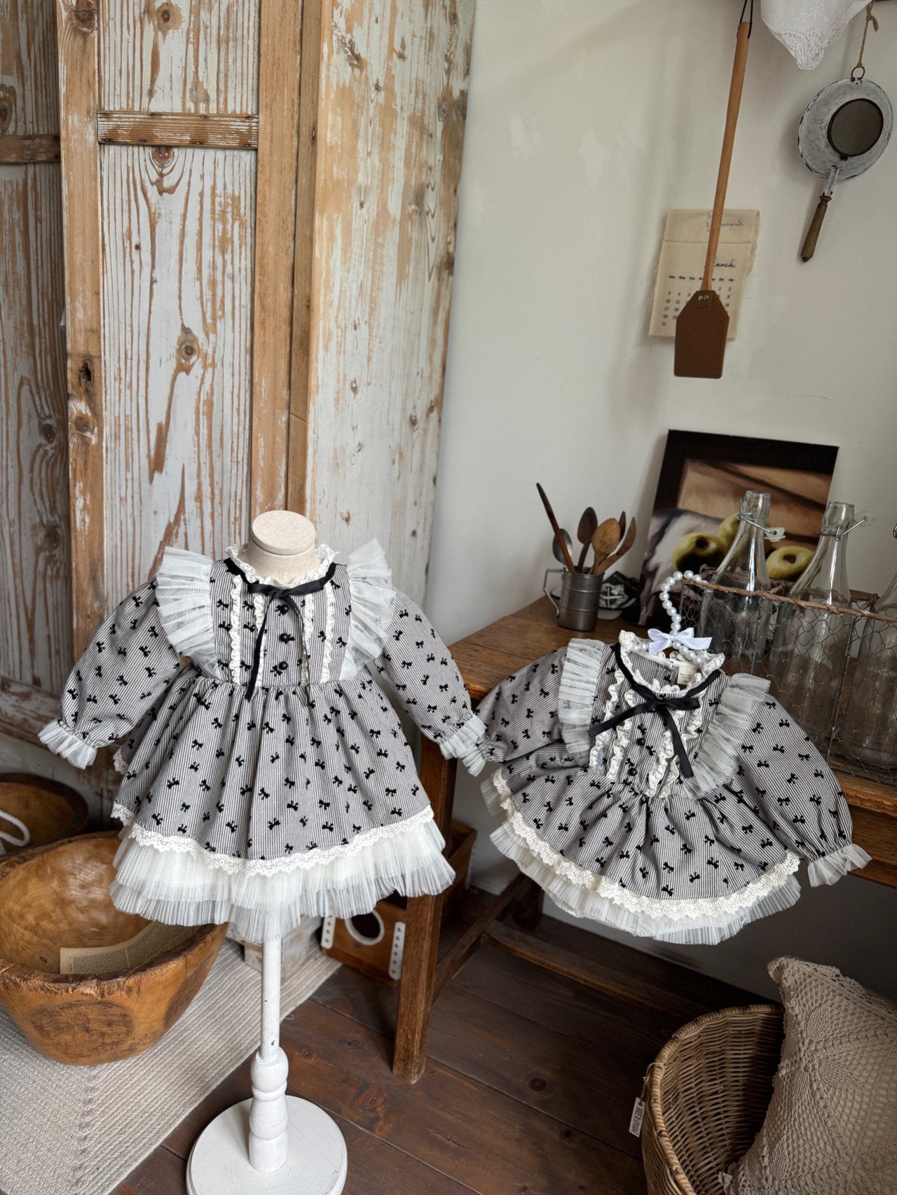 A charming lace frill dress adorned with delicate ribbon embroidery over fine stripes.