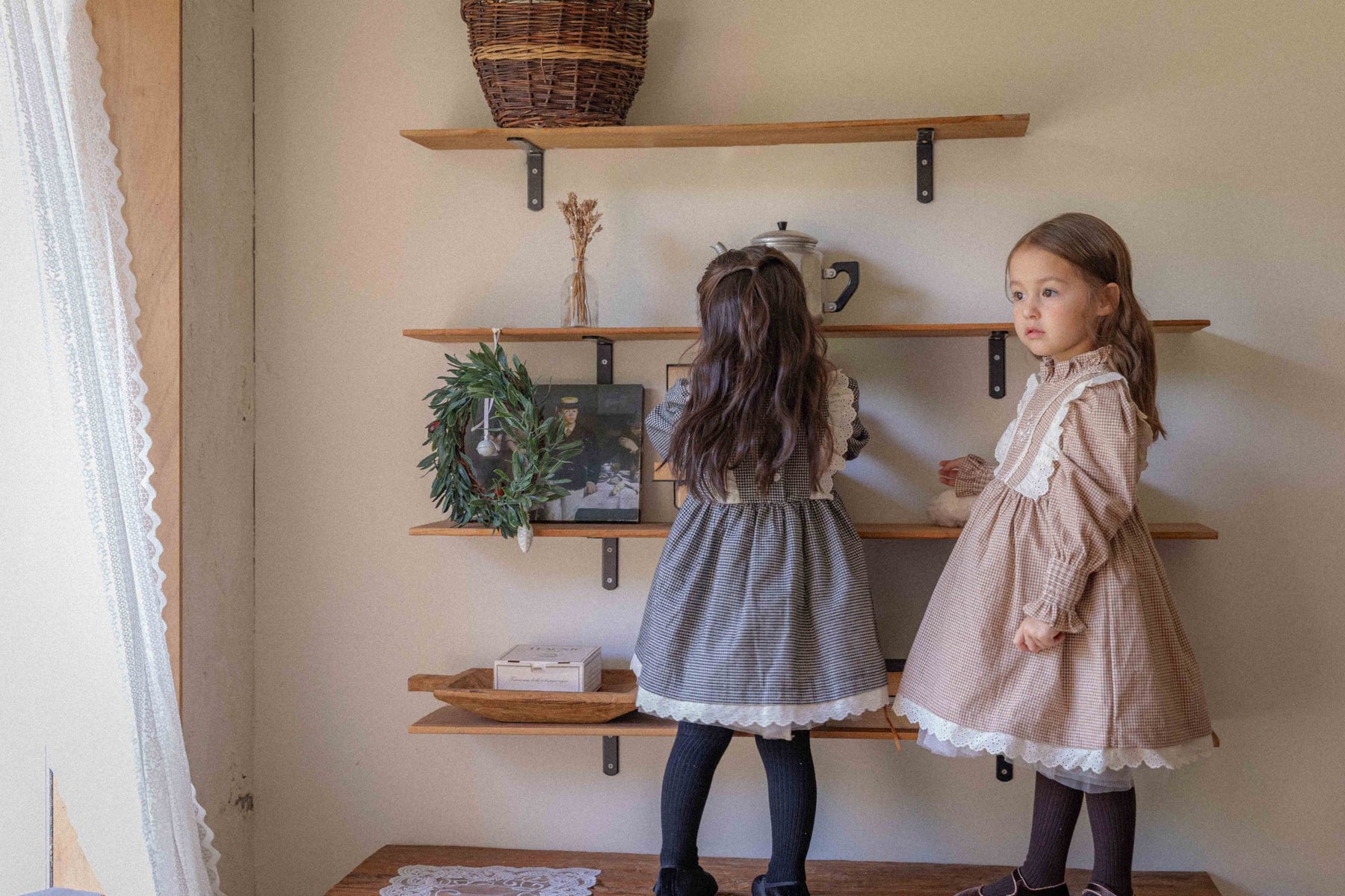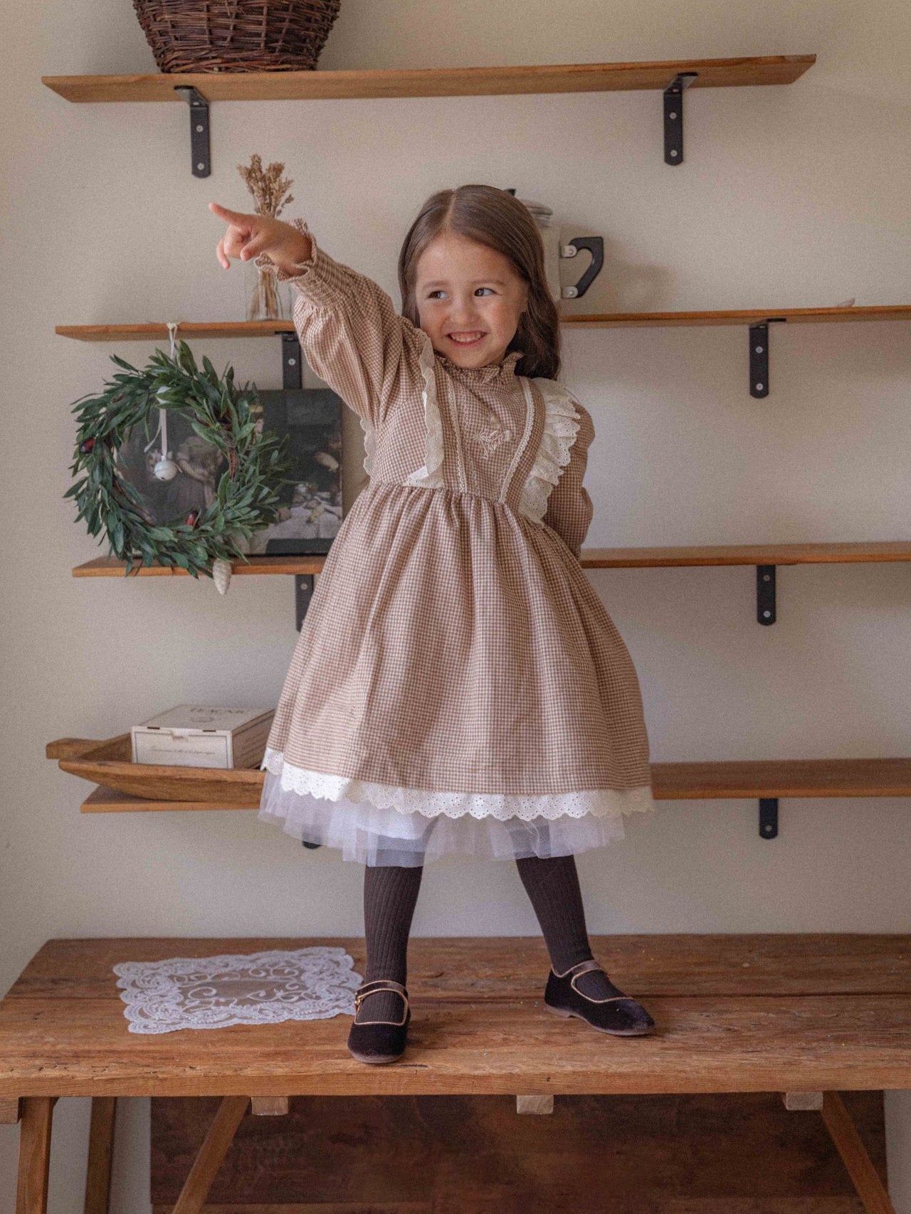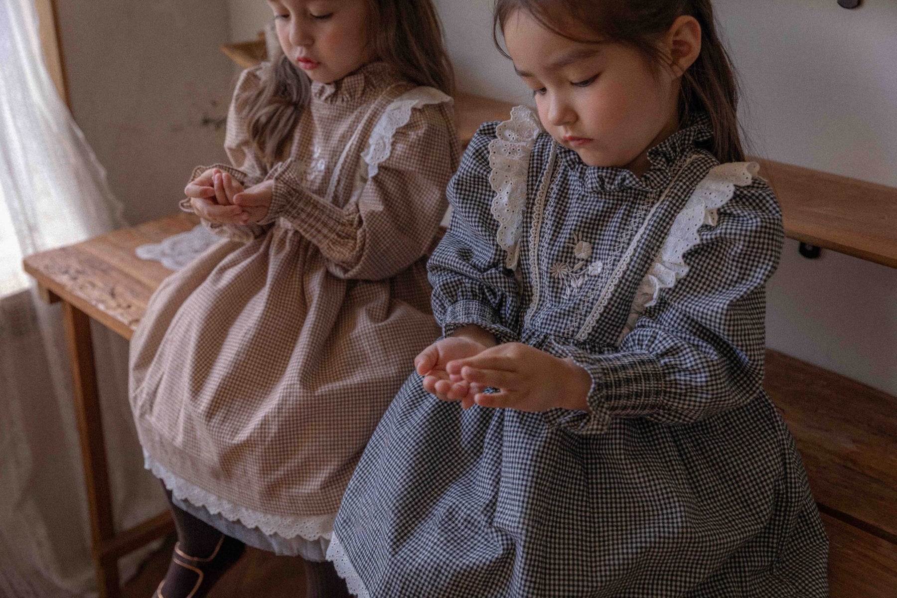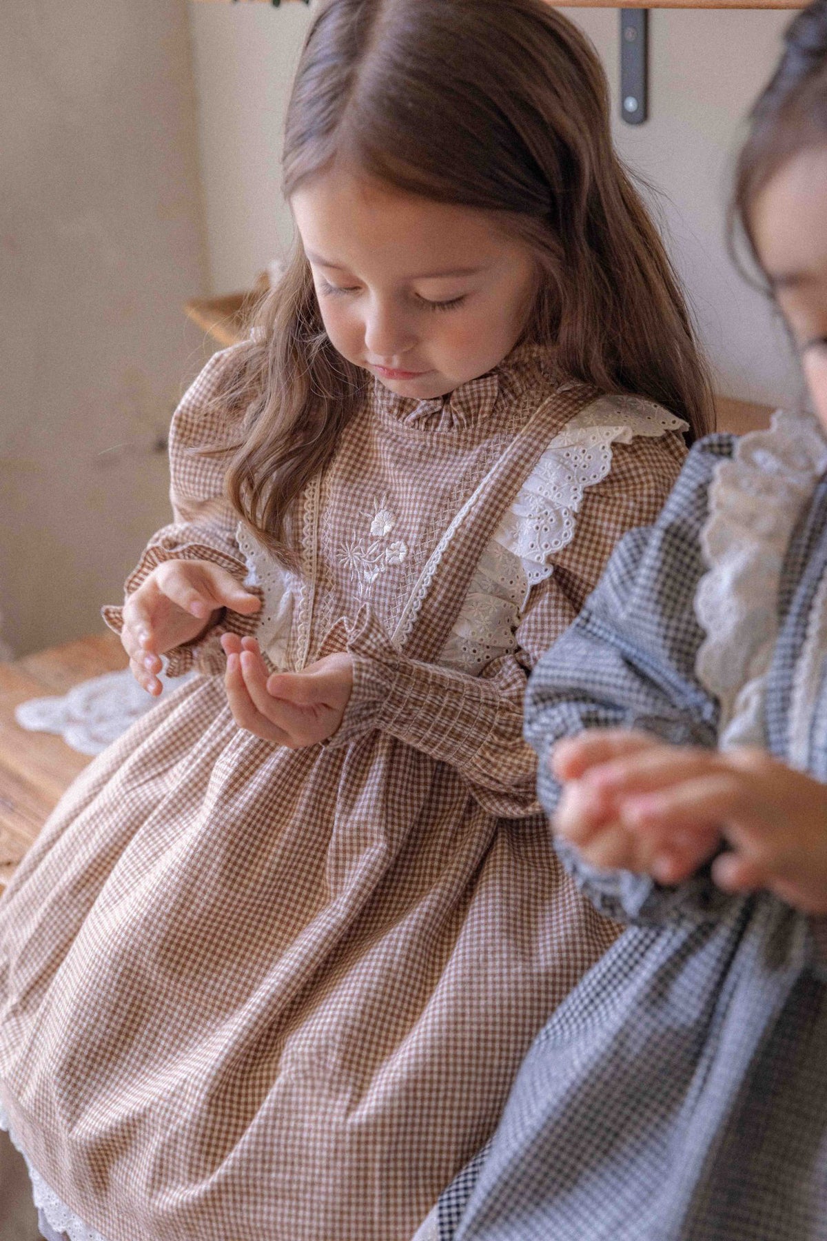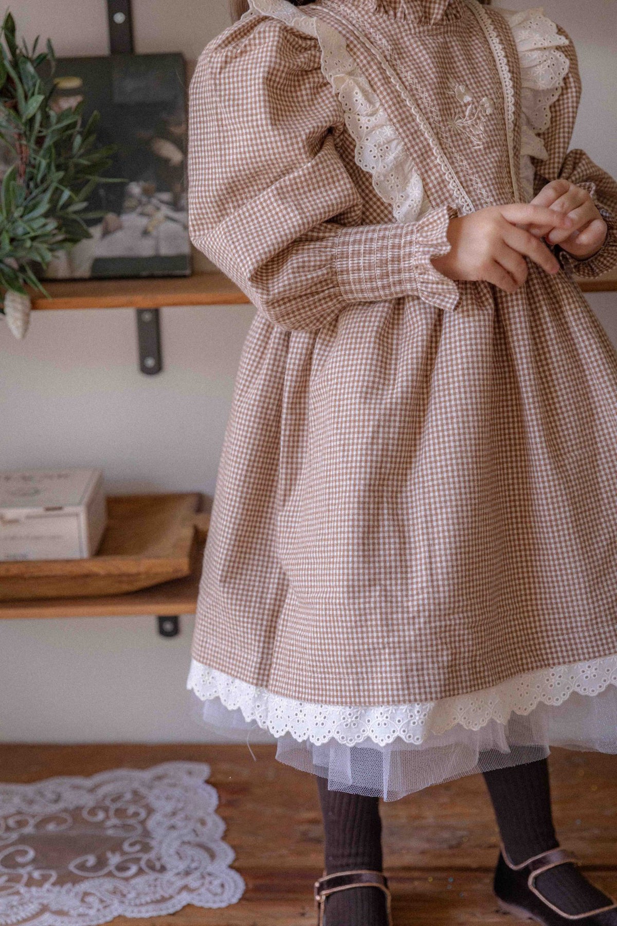 This winter dress features a classic French-inspired design, combining subtle gingham checks with delicate embroidery and cotton lace details.