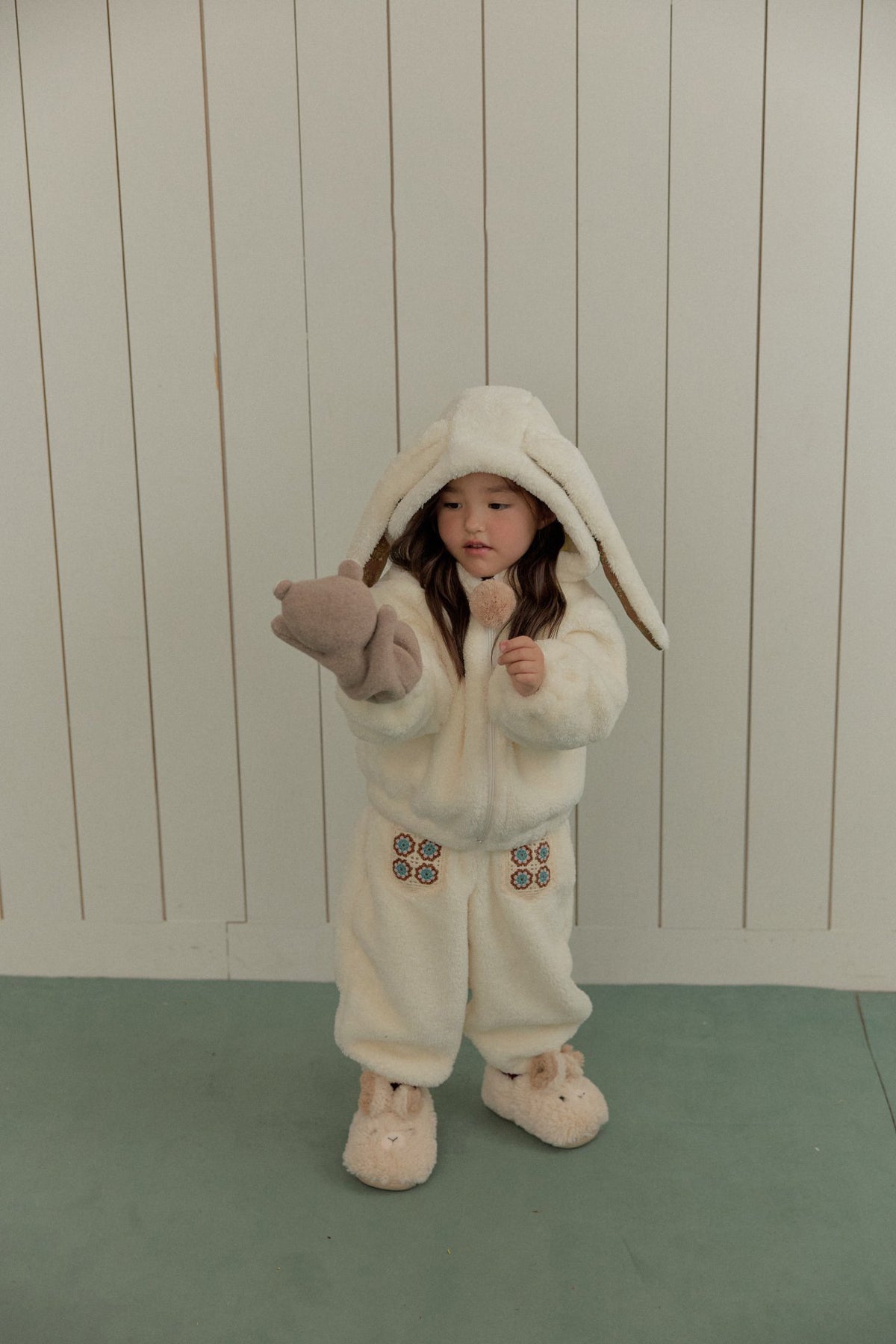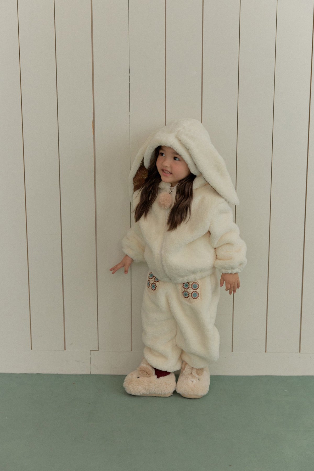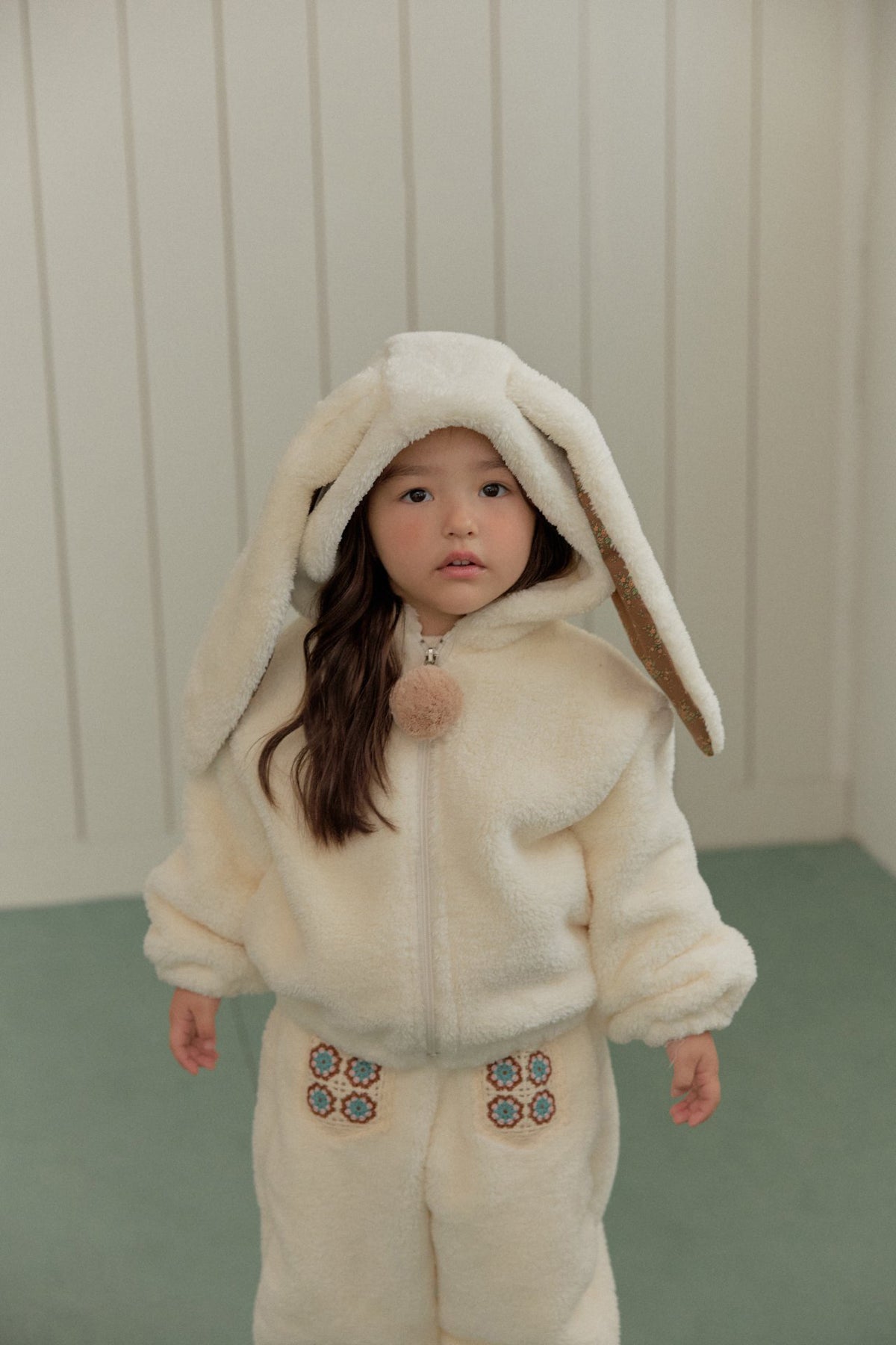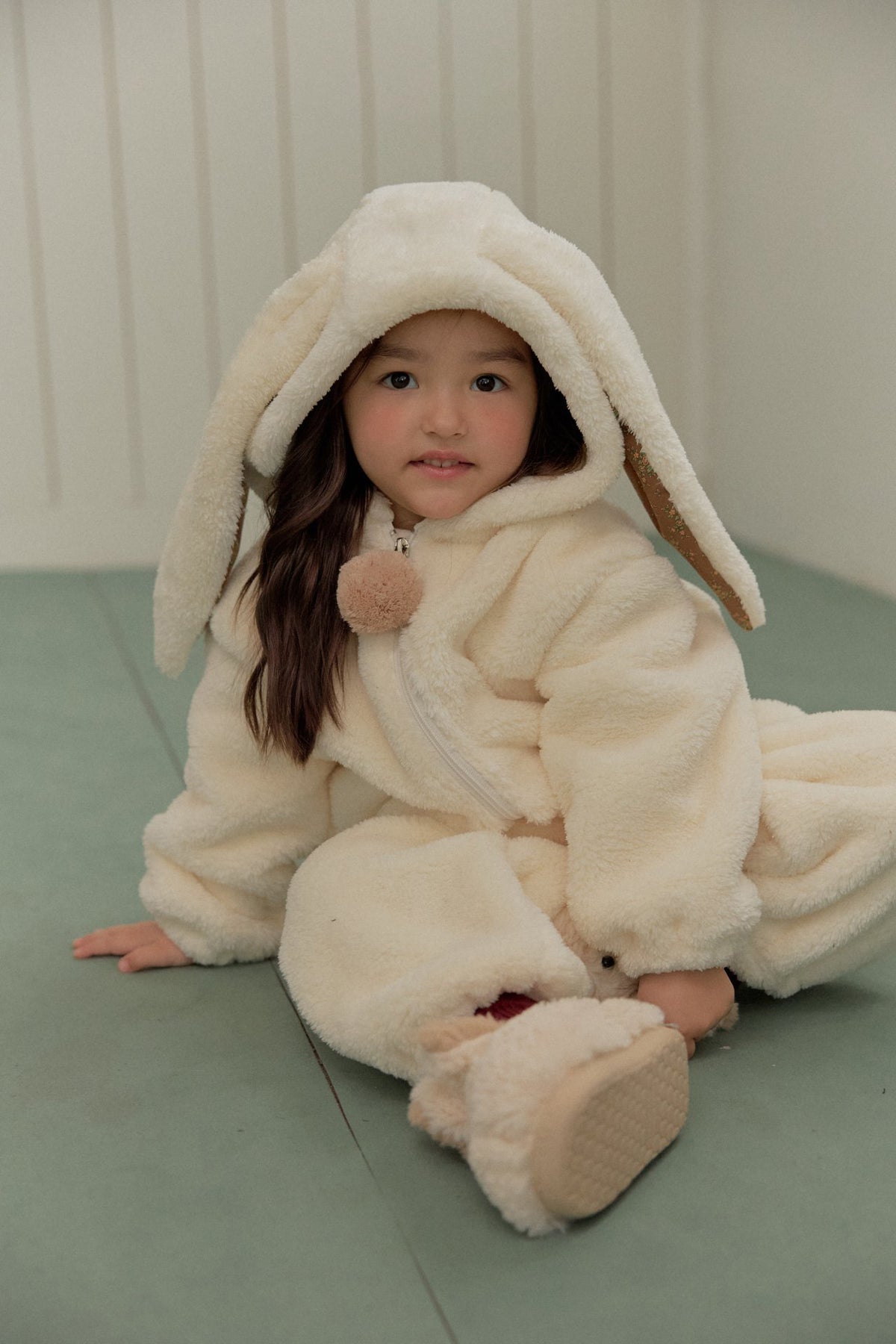 The hood features long bunny-ear details with a playful pom-pom accent, while the zip-up design makes dressing quick and easy.