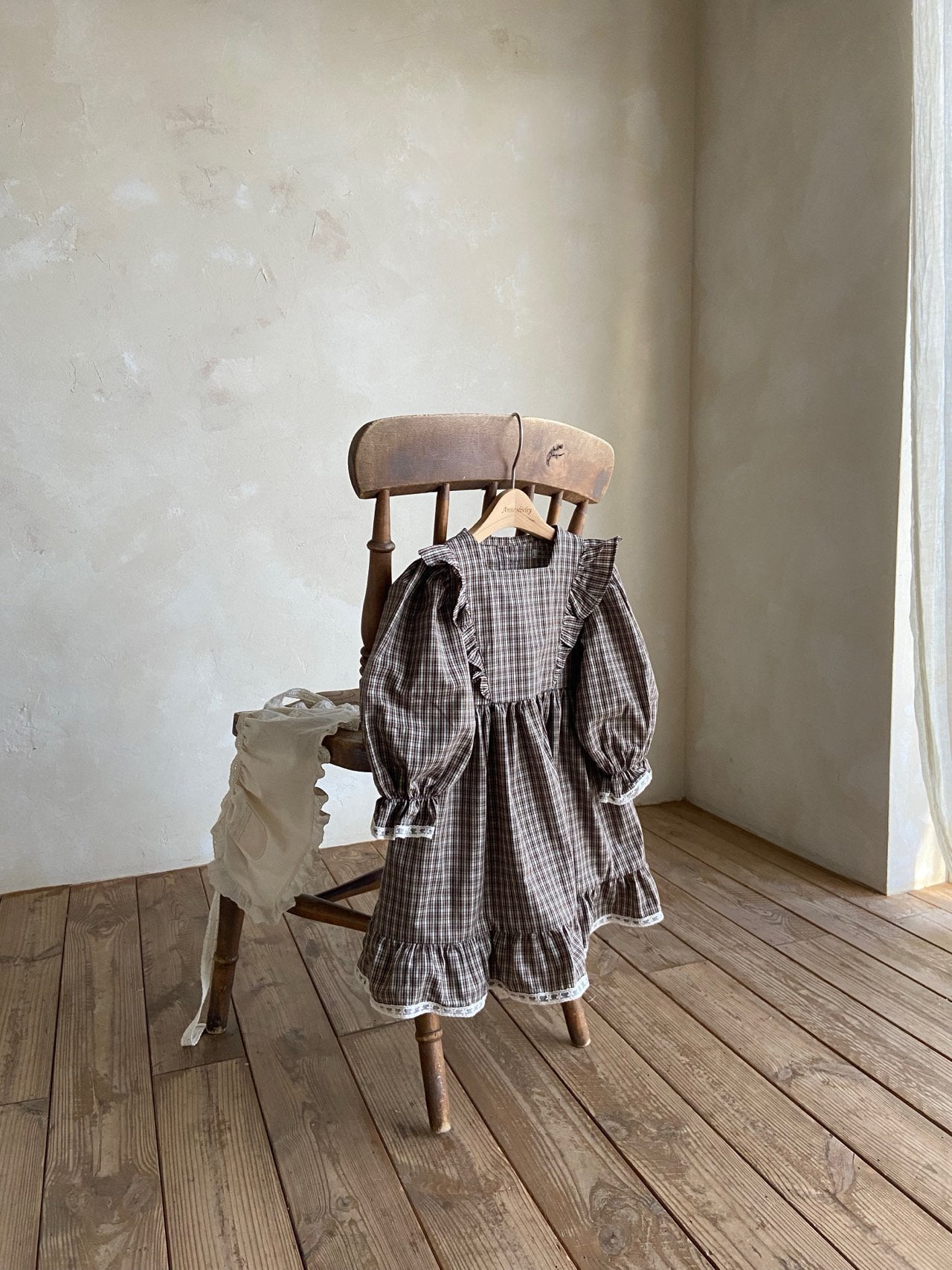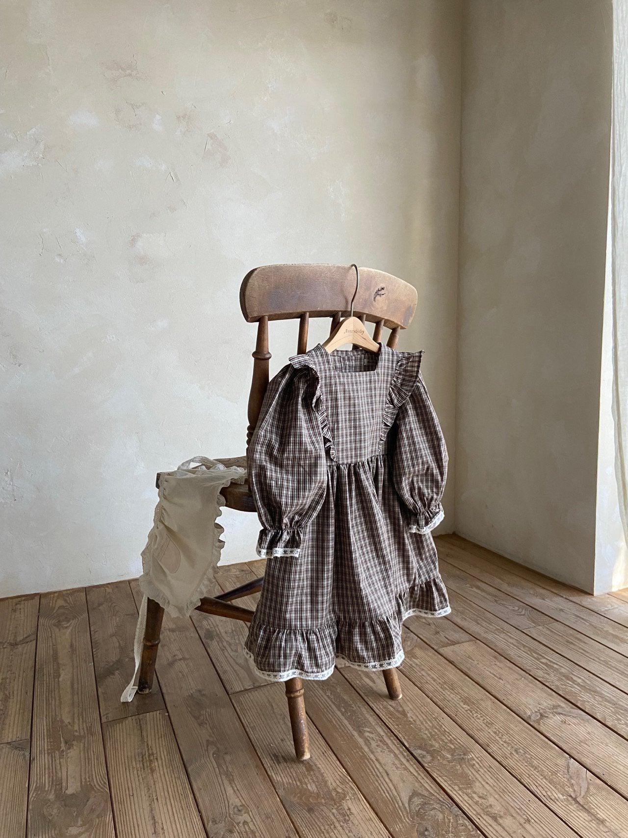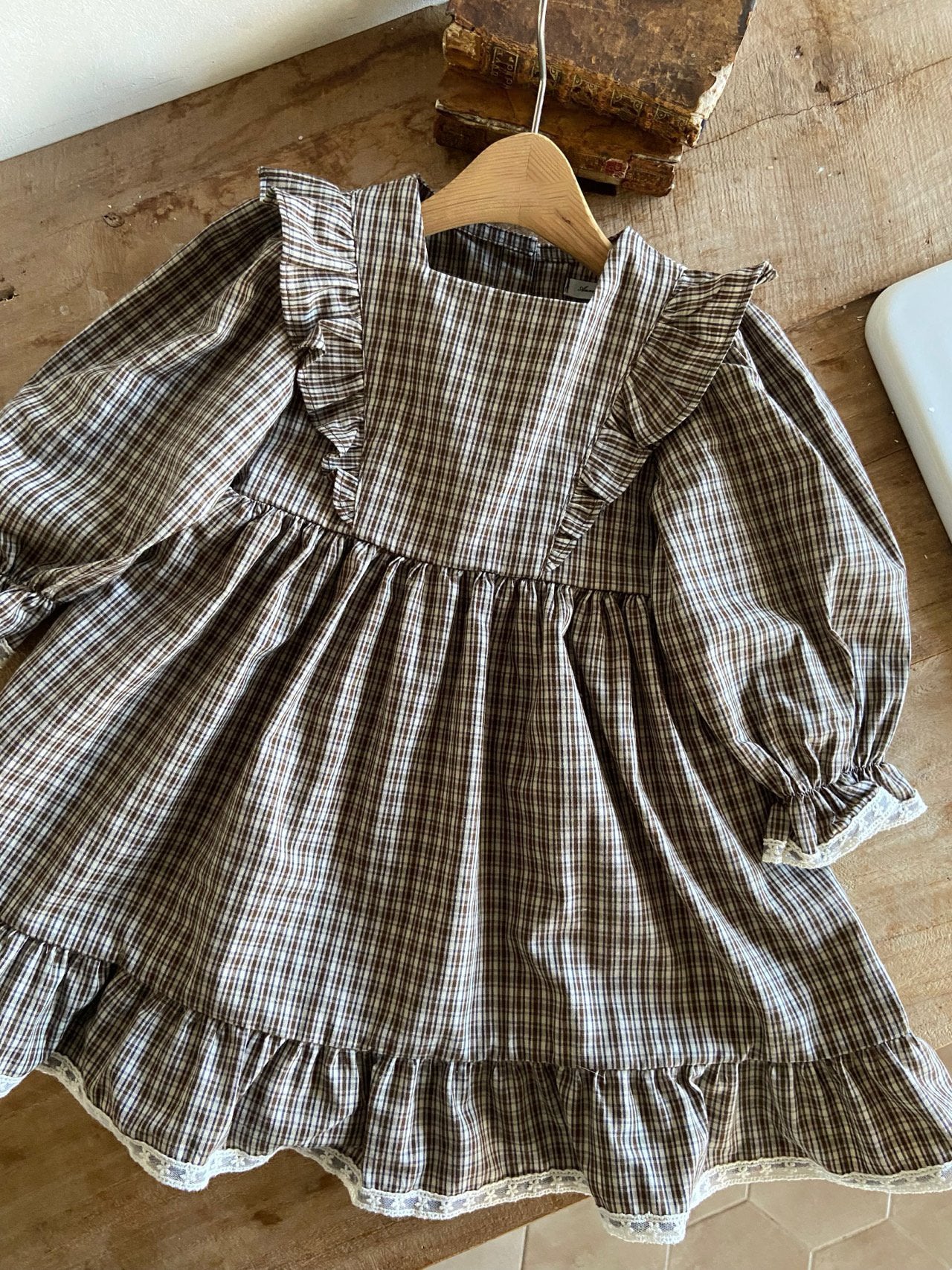 • Romantic girls dress featuring a delicate check pattern with frill and lace details