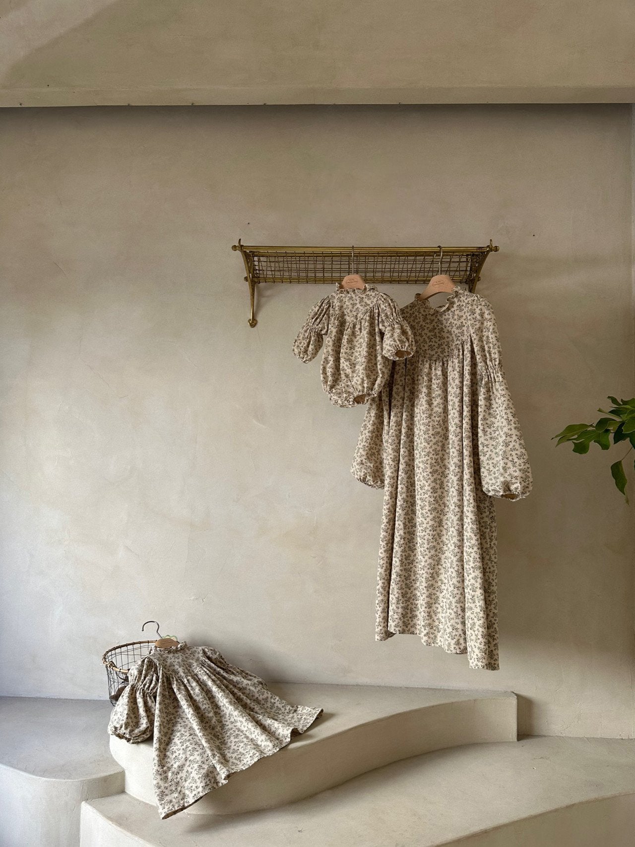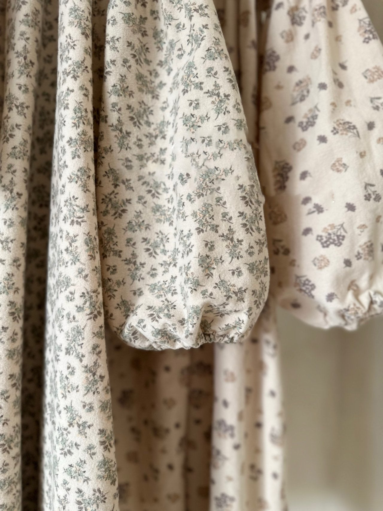 A vintage-inspired floral dress featuring soft, delicate tiny blooms.