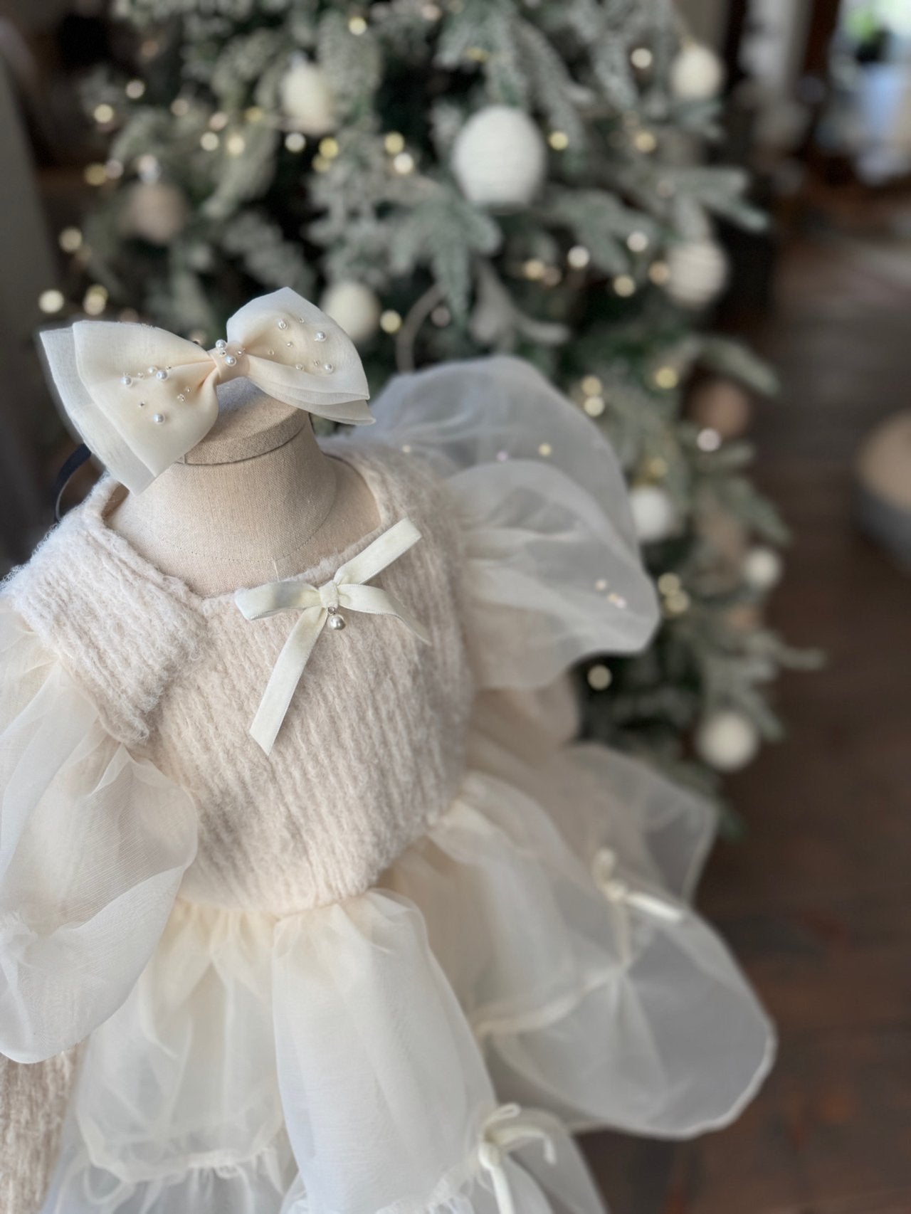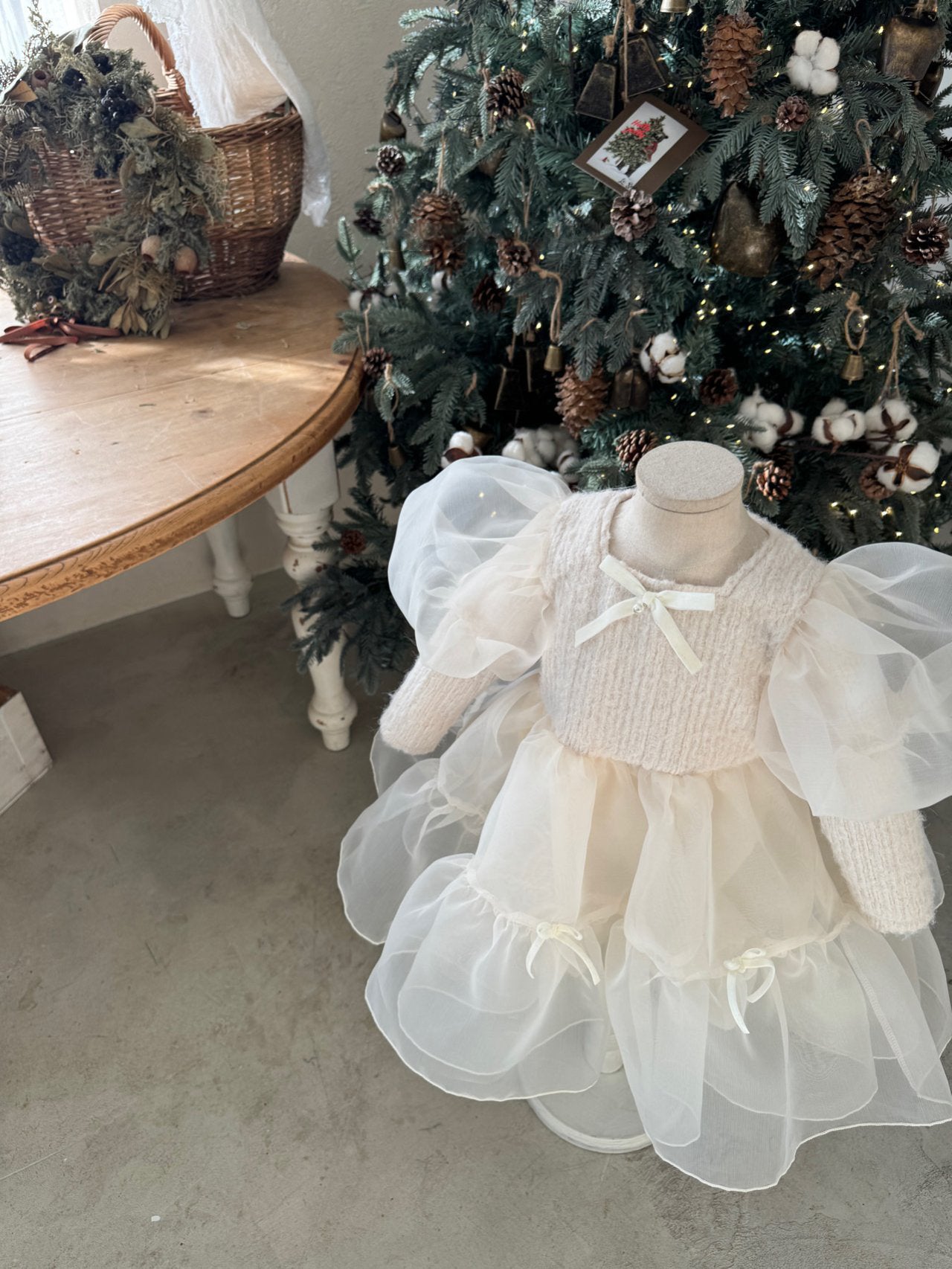 A romantic dress featuring a cozy knit bodice, airy tulle skirt, and voluminous chiffon puff sleeves.