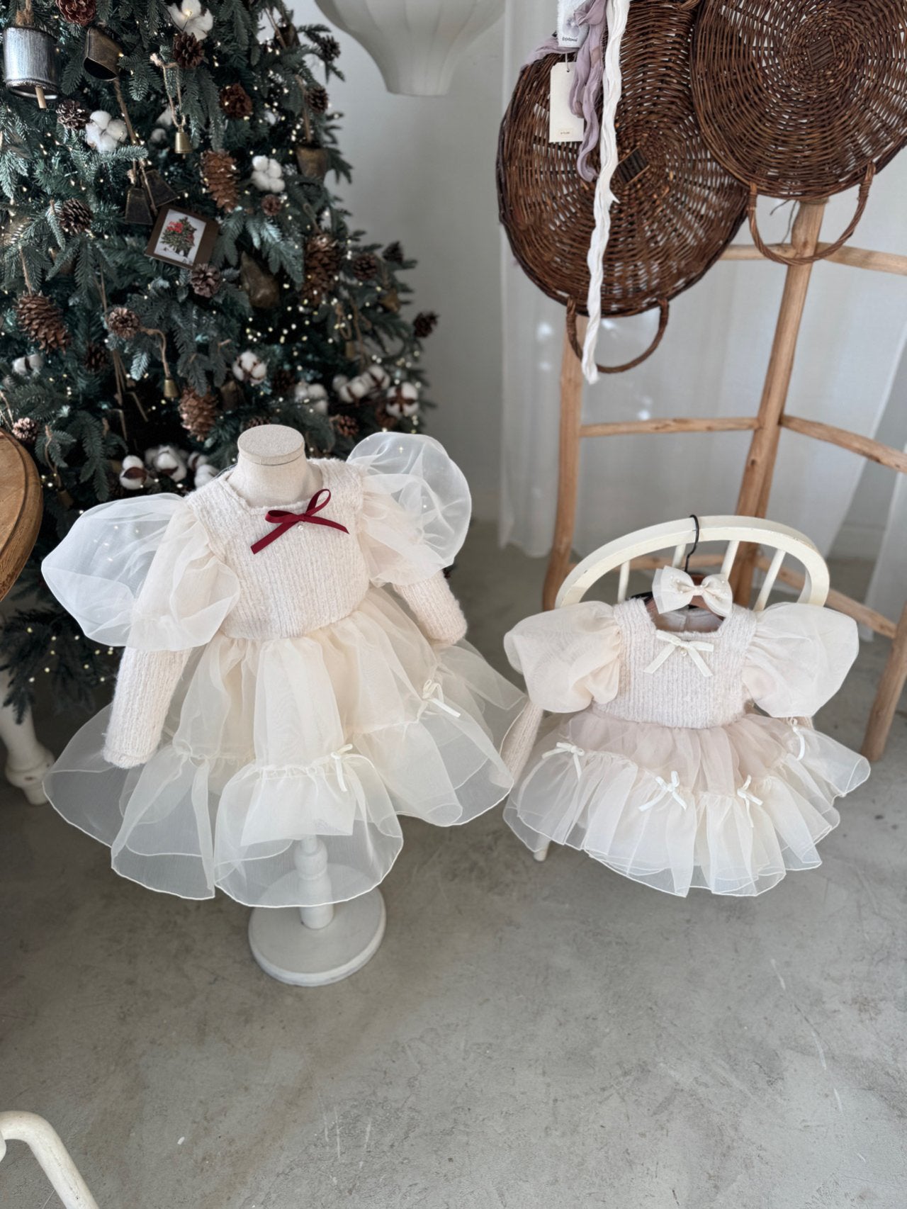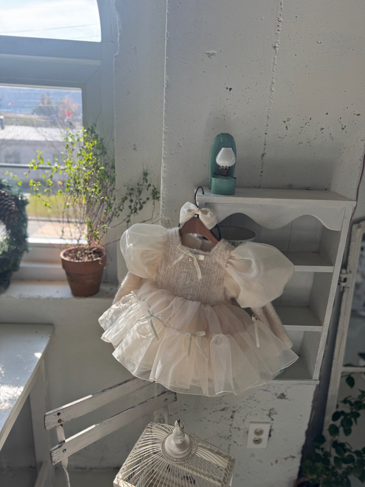 A special dress romper featuring a soft smocked knit bodice with airy chiffon puff sleeves and a tulle skirt.