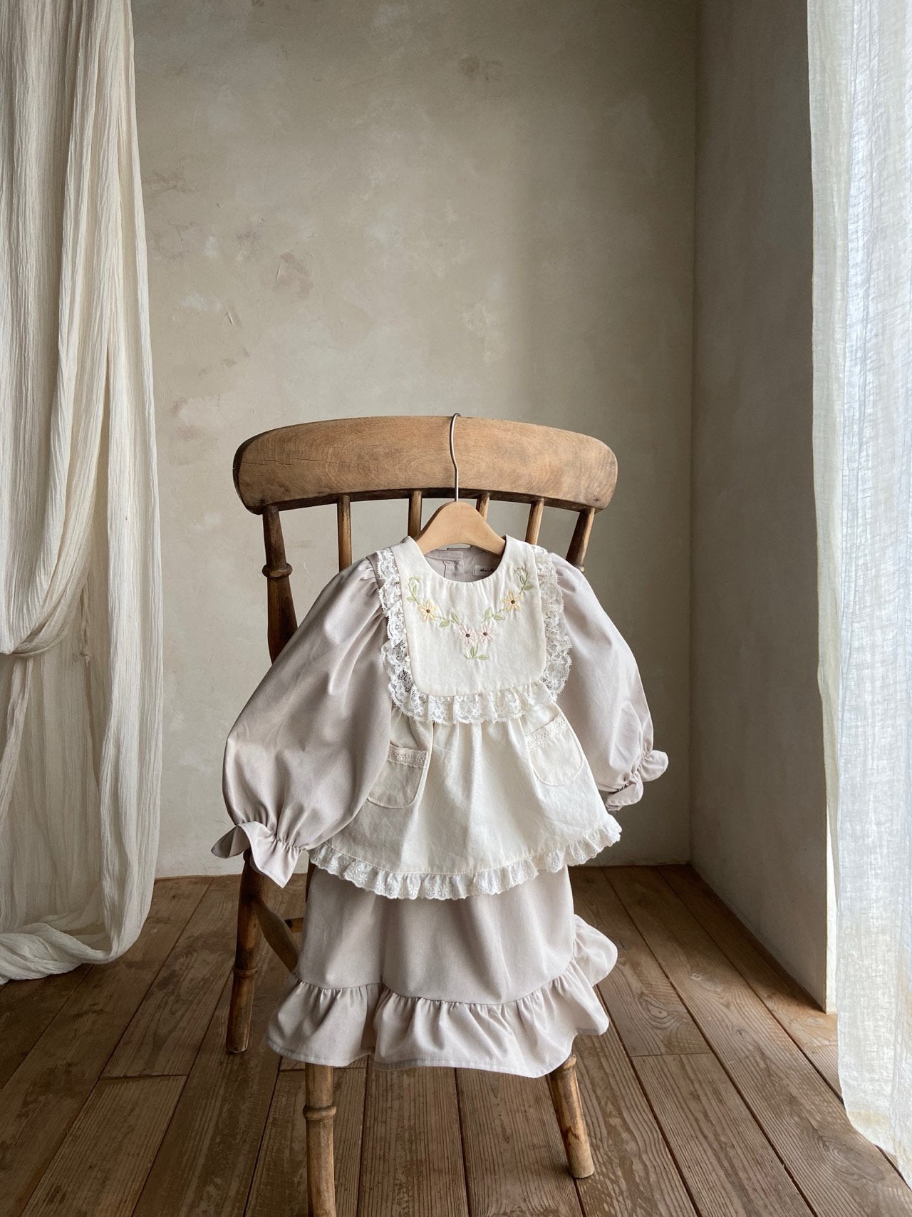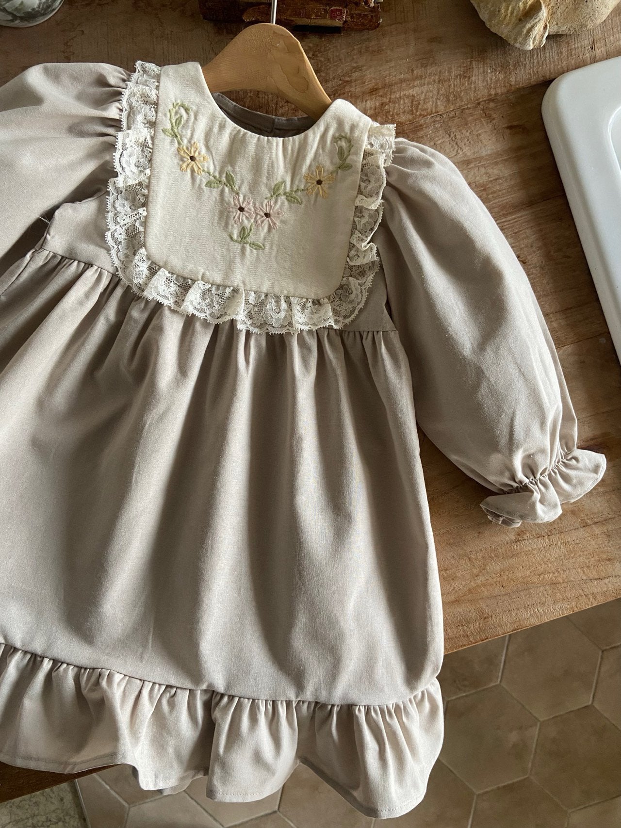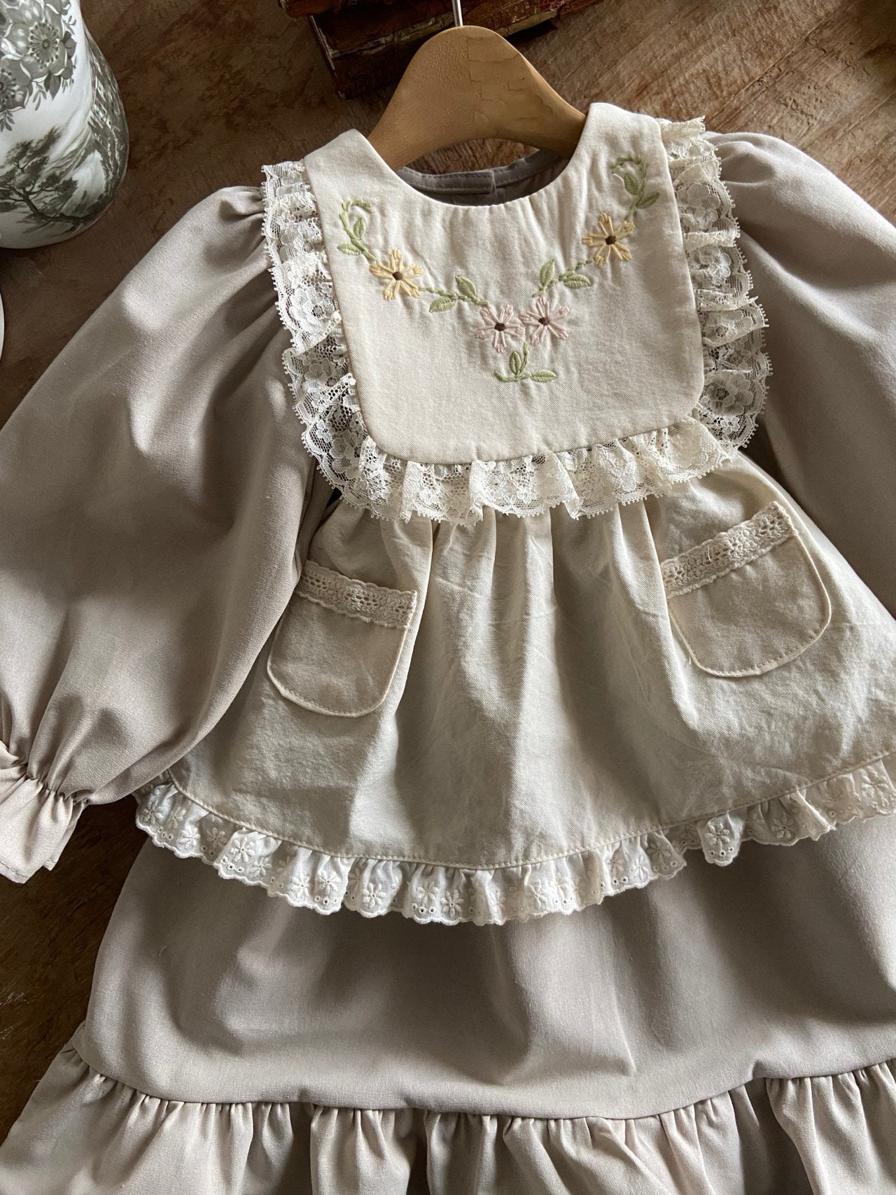 • Charming girls dress with a wide collar featuring delicate vintage floral embroidery