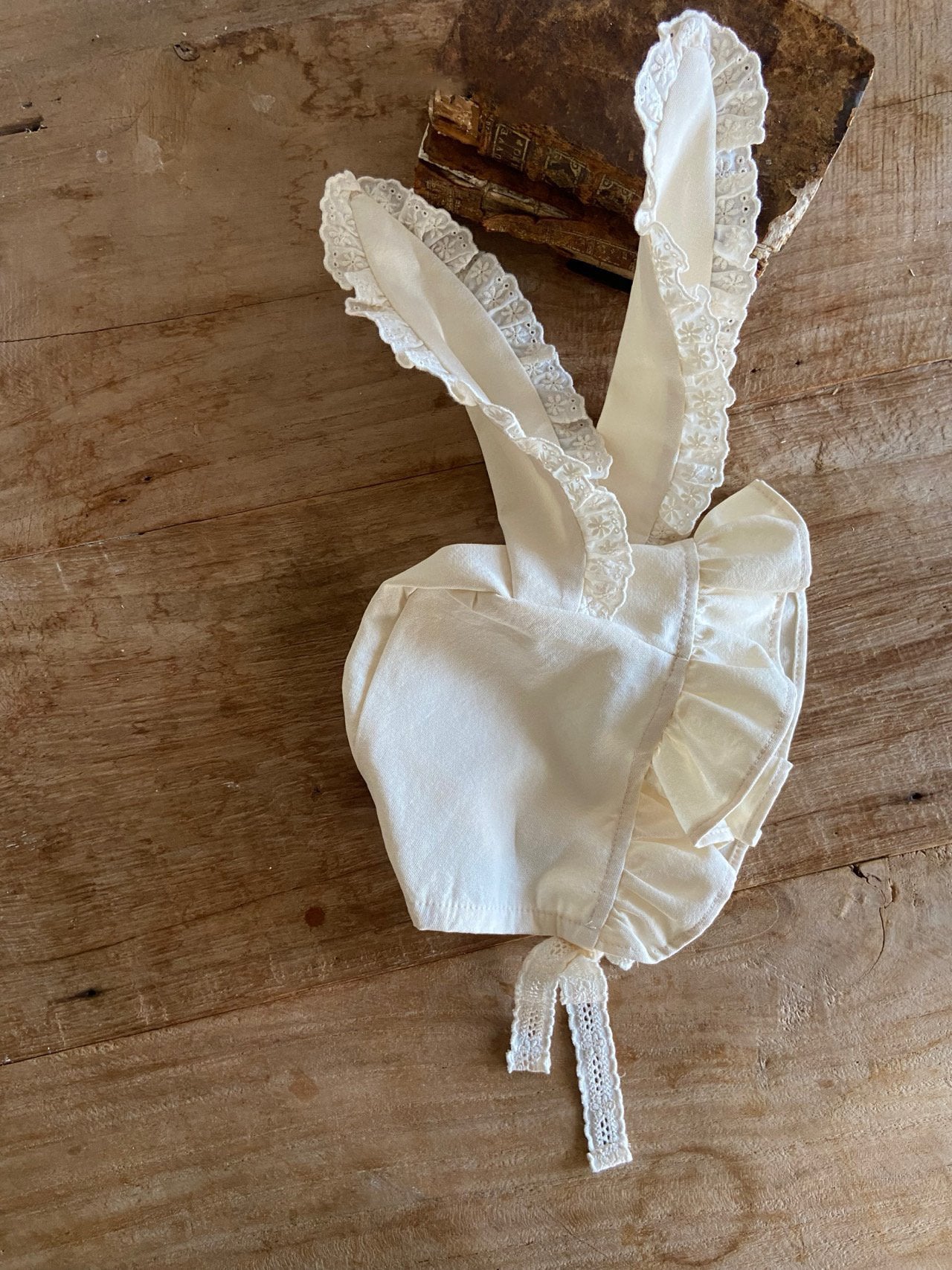 • Adorable bunny bonnet featuring oversized ears adorned with soft frills