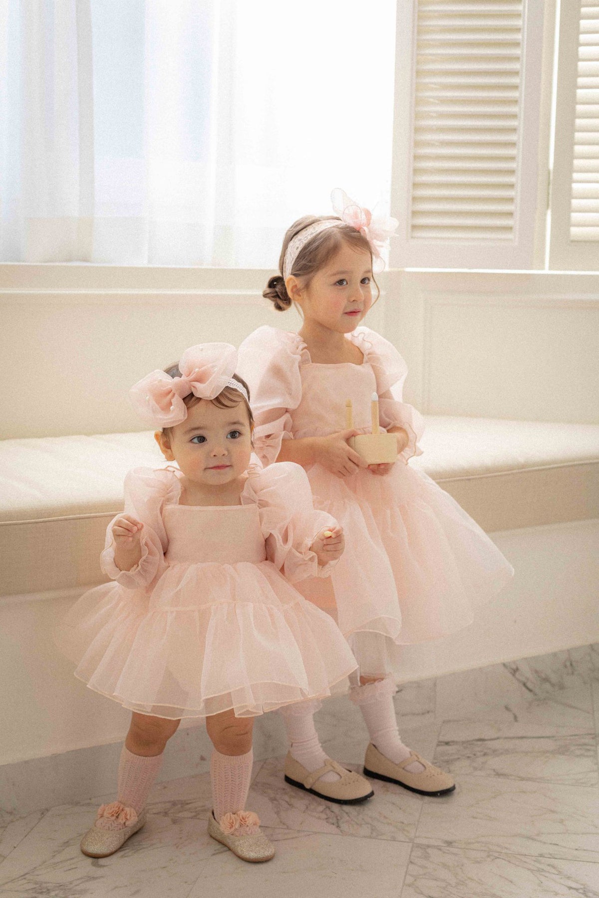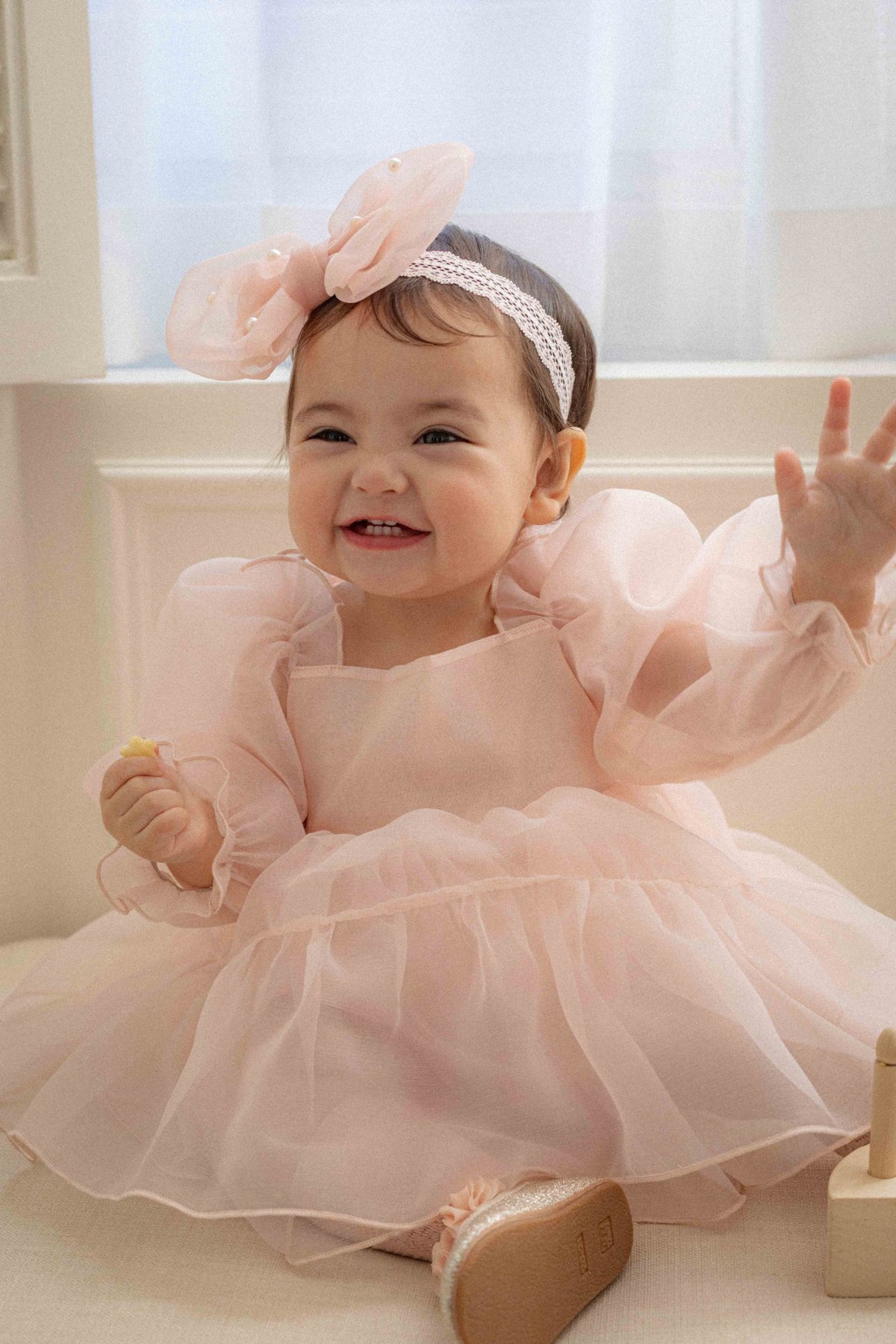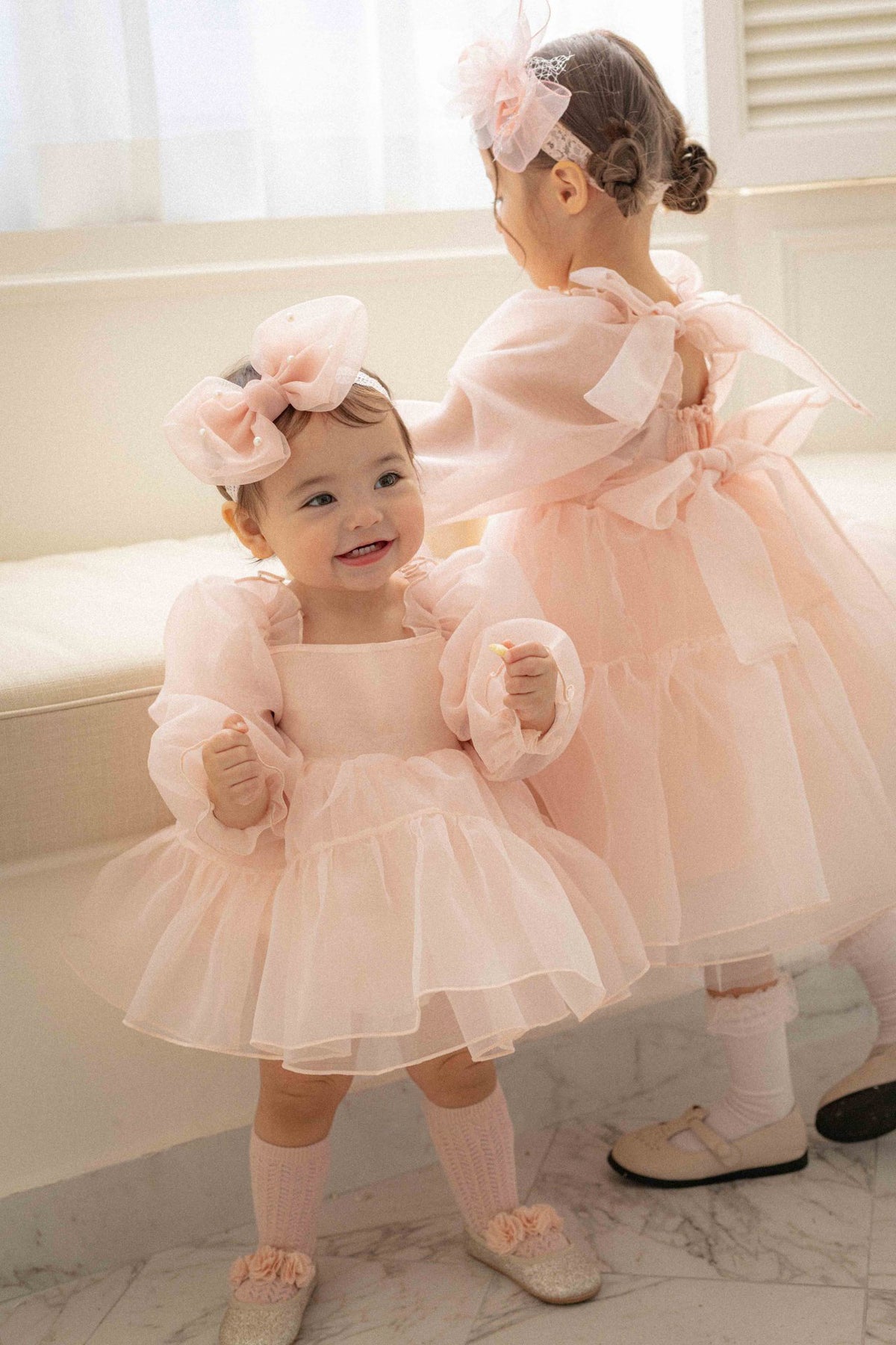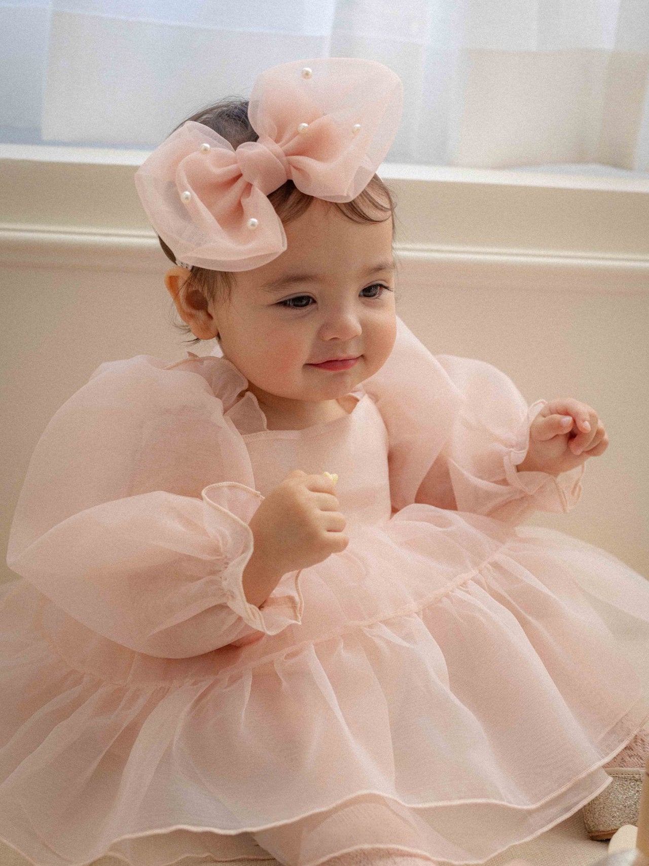 • Exquisite baby dress romper crafted from soft, premium organza in a delicate powder pink tone