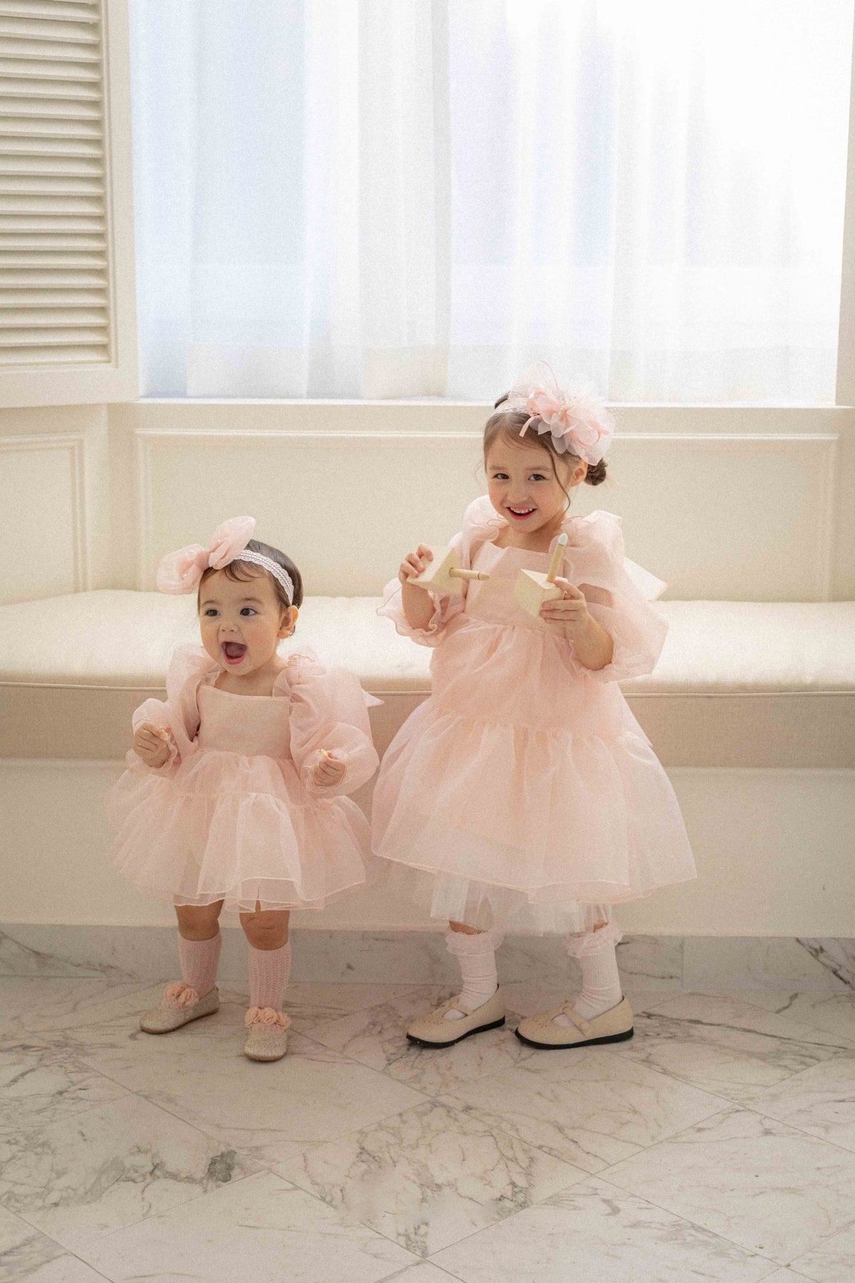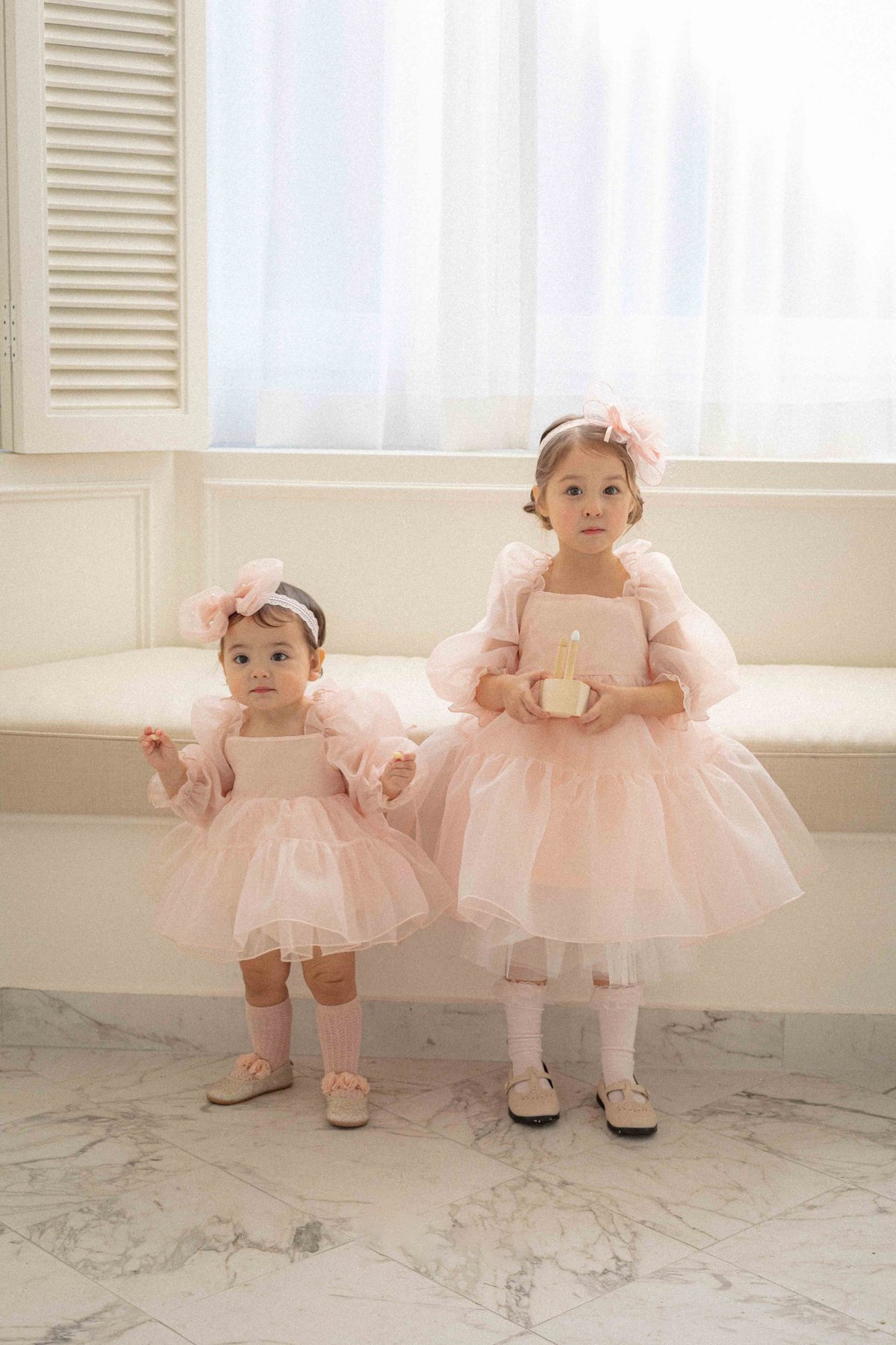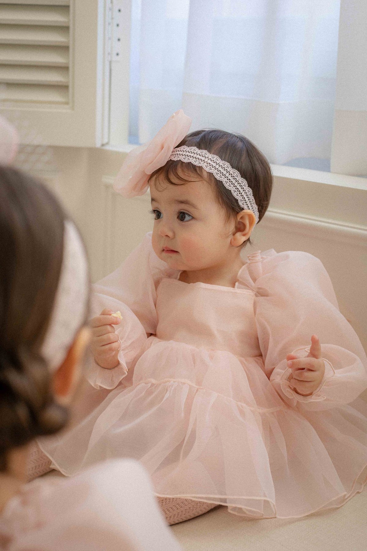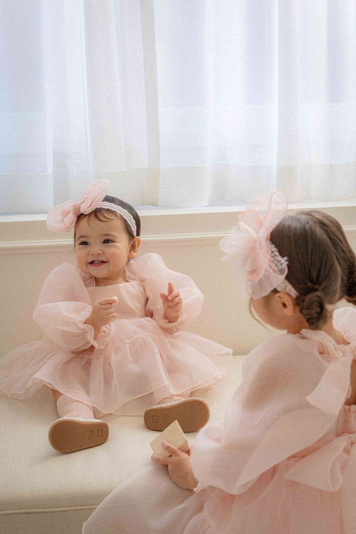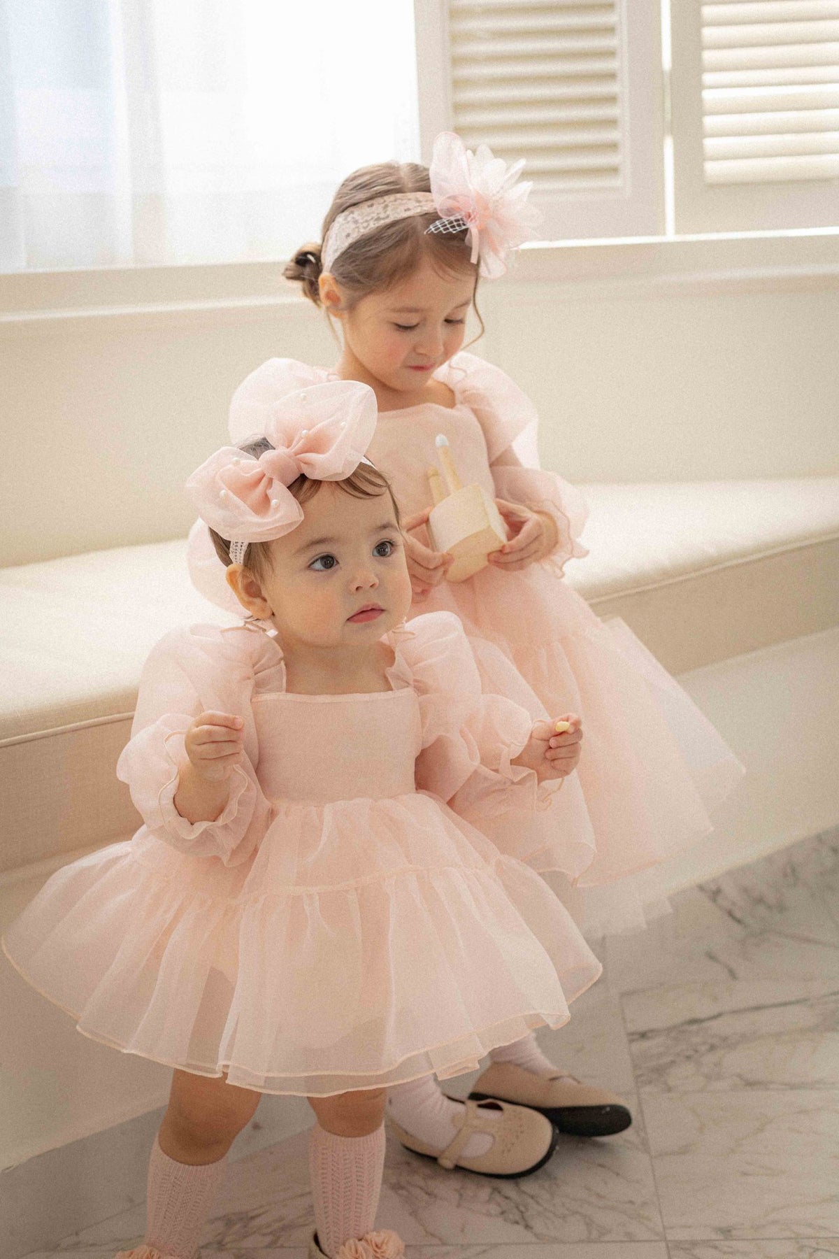 • Exquisite baby dress romper crafted from soft, premium organza in a delicate powder pink tone