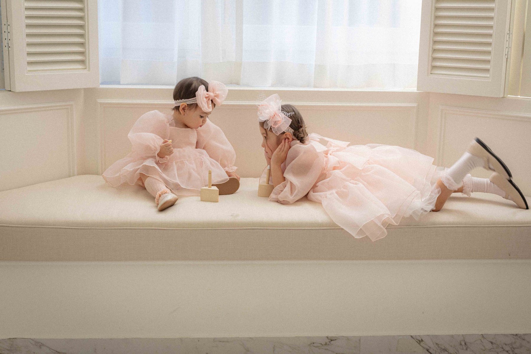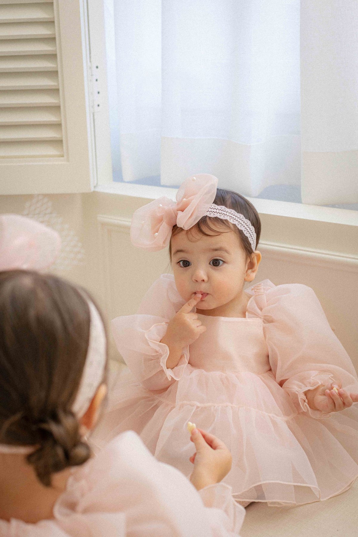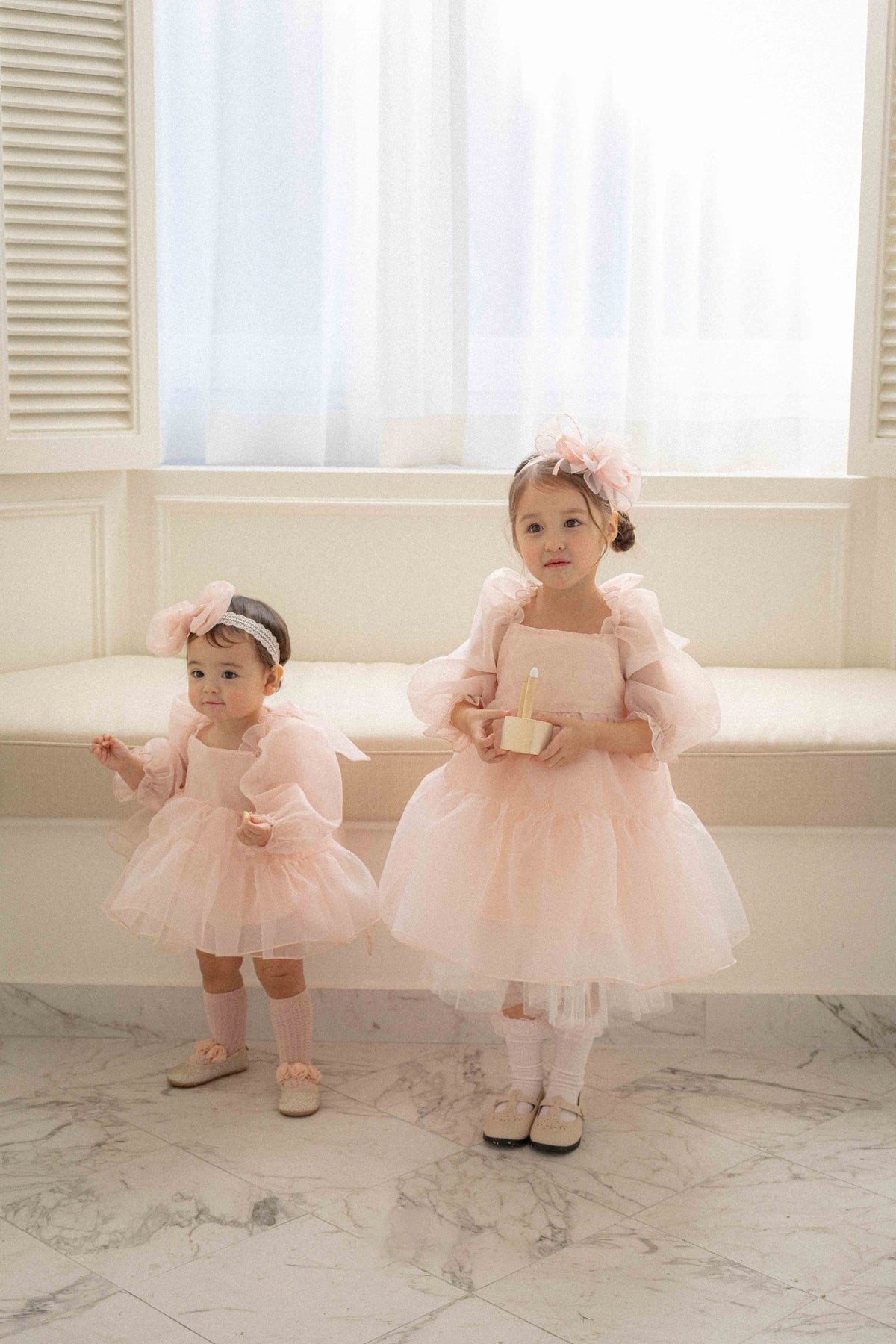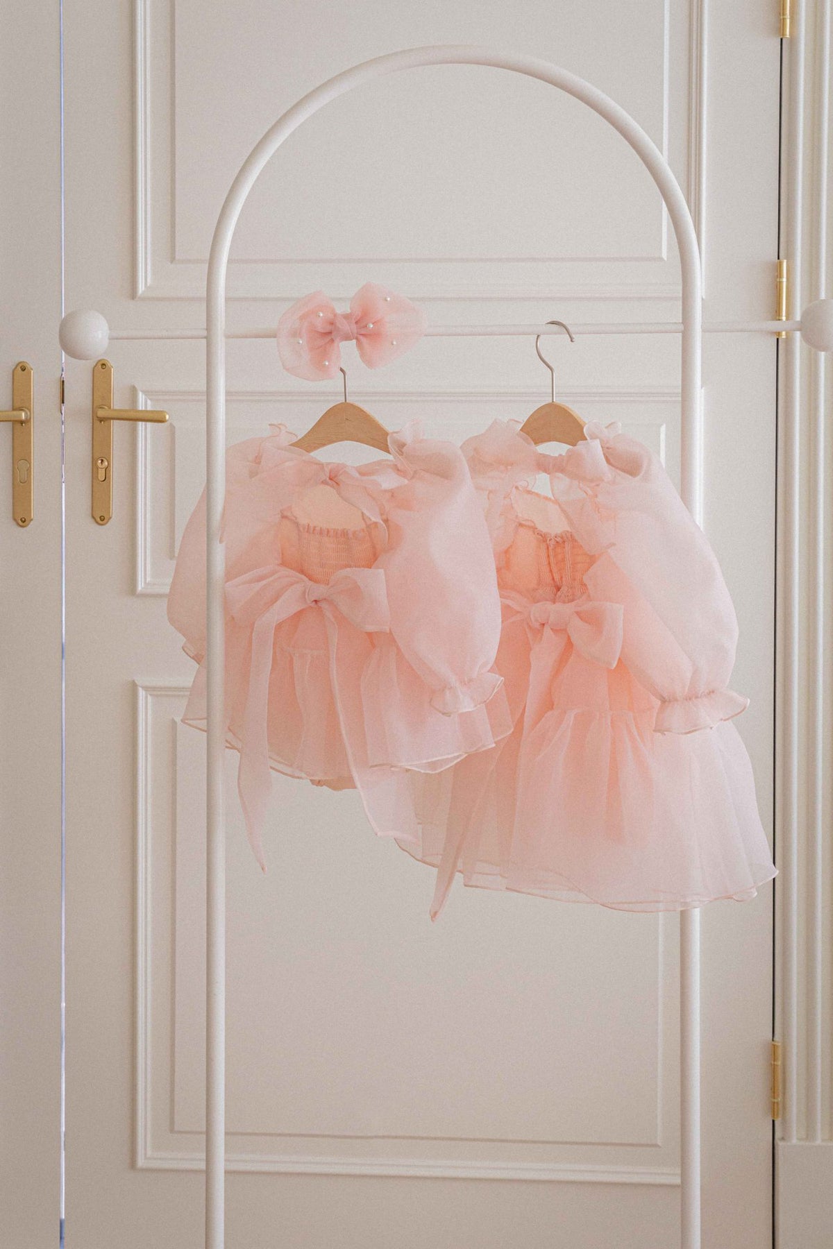 • Exquisite baby dress romper crafted from soft, premium organza in a delicate powder pink tone